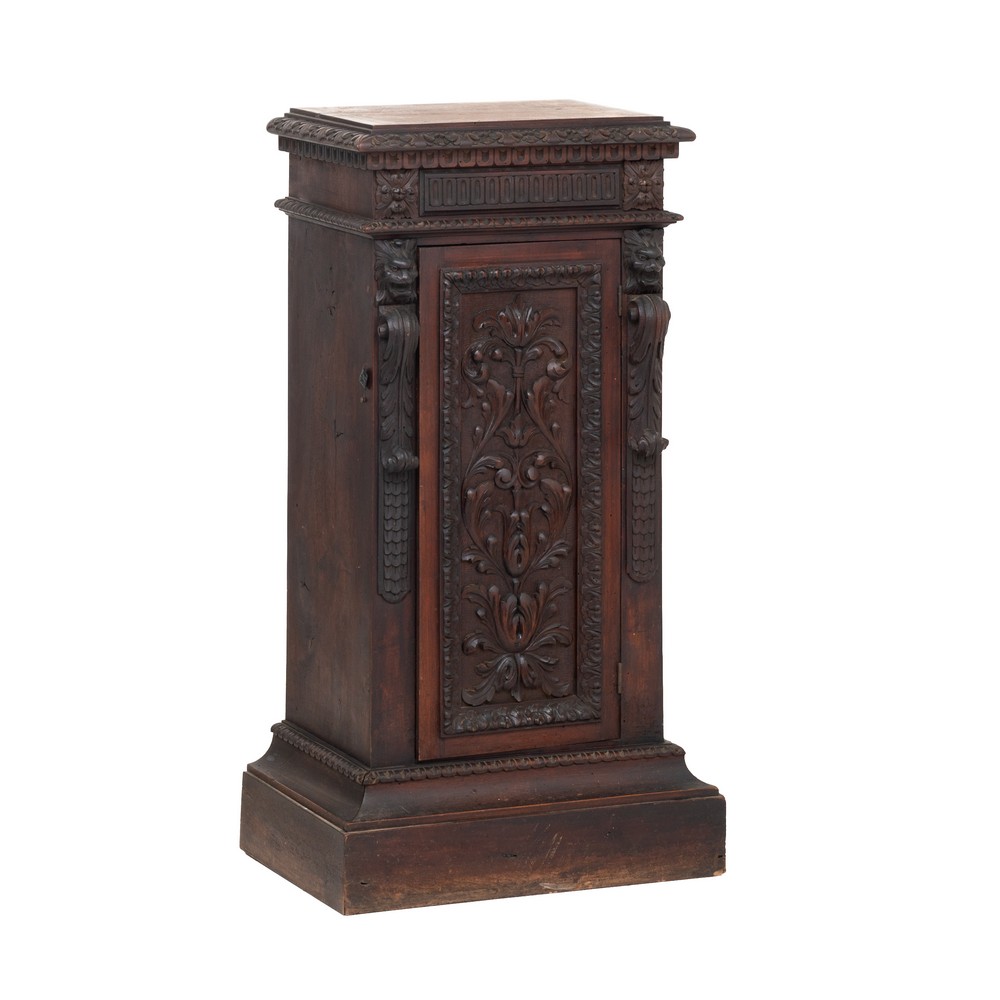 Comodino ad un'anta rinascimentale in legno di noce riccamente intagliato.