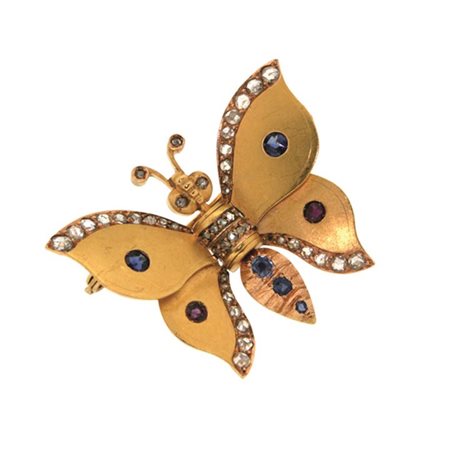 Spilla in oro giallo a forma di farfalla con ali satinate, impreziosite da piccoli rubini, zaffiri e diamanti