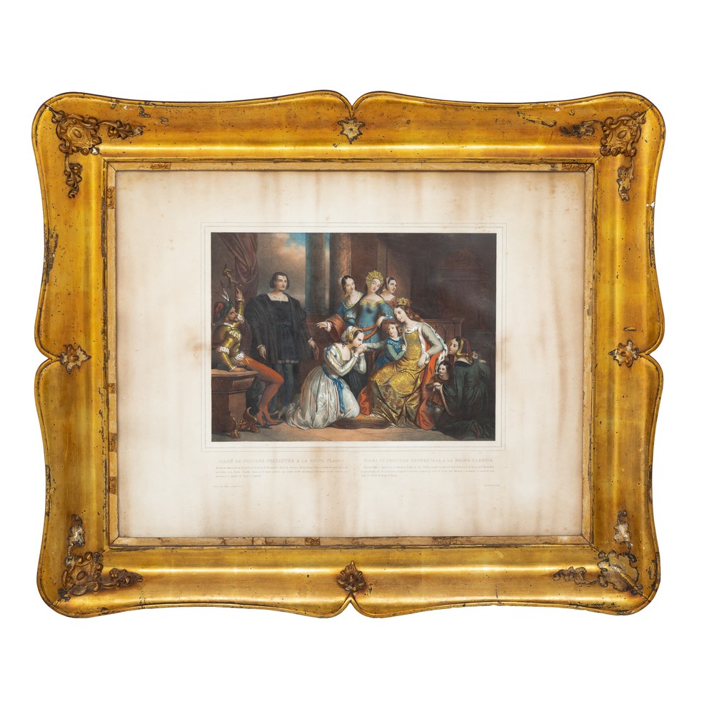 Cornice a guantiera in legno dorato ad argento a mecca con all'interno incisione a colori (usure e mancanze).