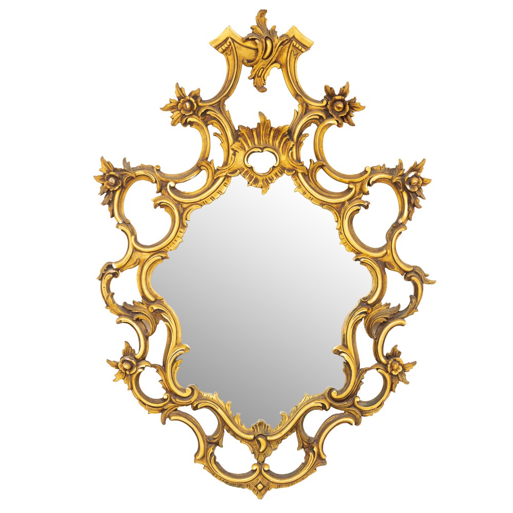 SPECCHIERA a scudo di gusto barocco in legno dorato (usure).