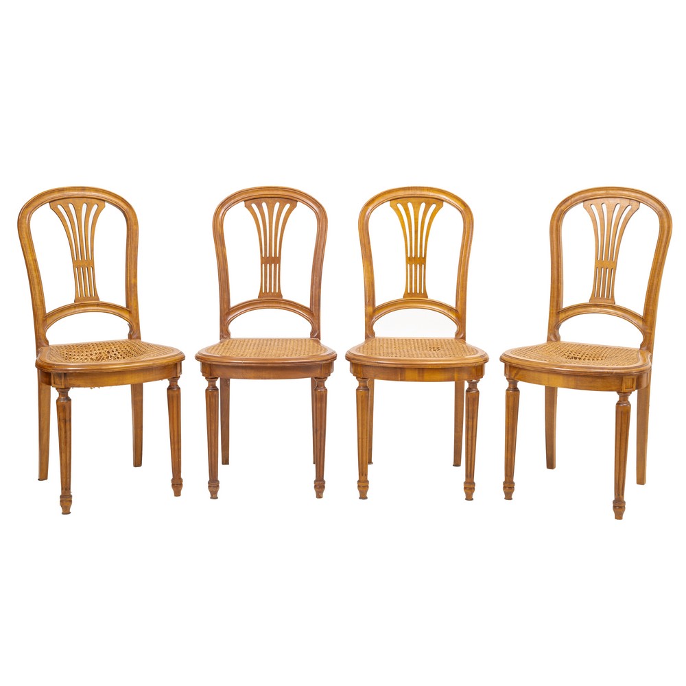 QUATTRO SEDIE in legno di noce con spalliera e seduta in finocchino (difetti).