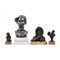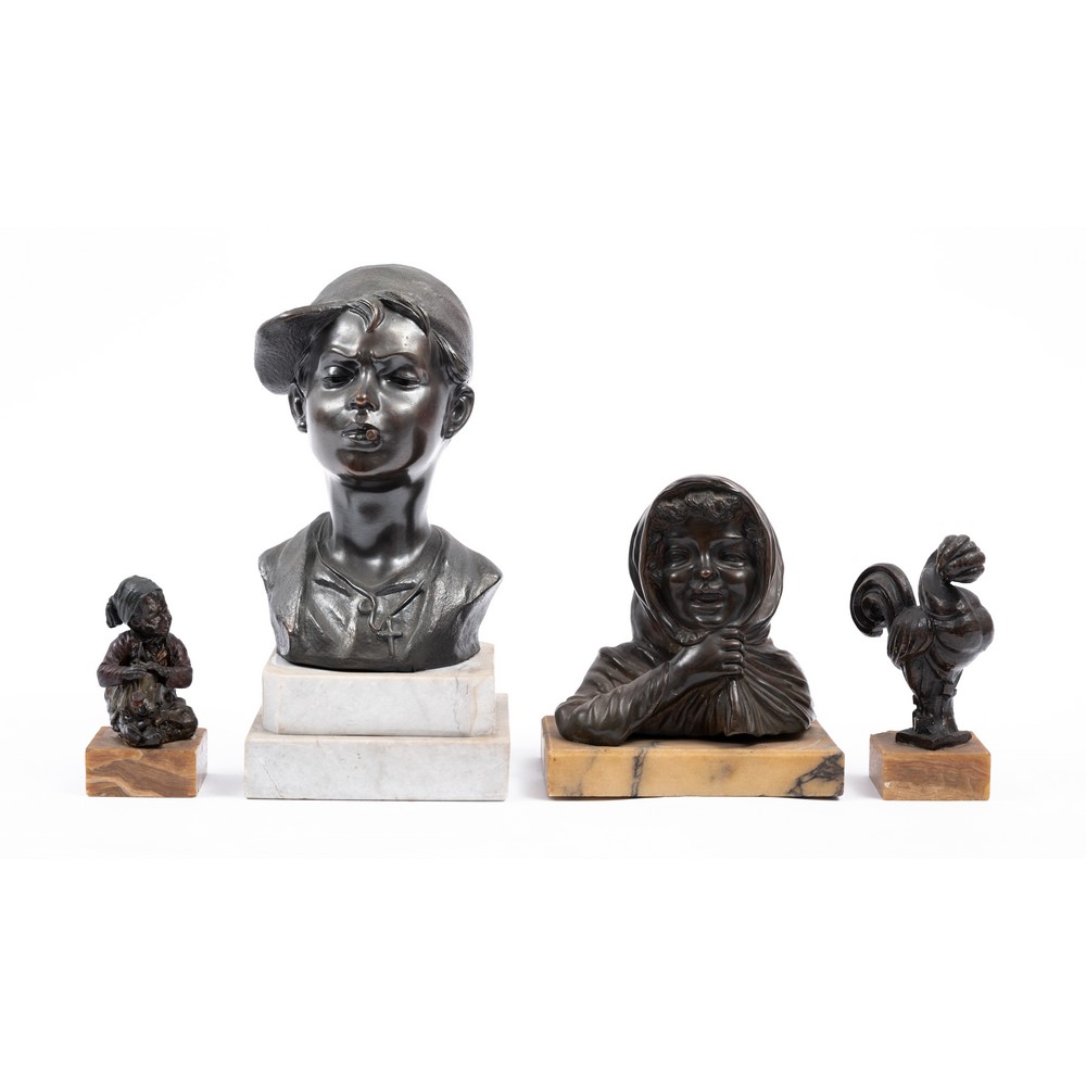 QUATTRO SCULTURE in metallo raffiguranti "Mezzobusto di bambino", "Mezzobusto di bambina", "Volatile" e "Fanciullo" con basi in marmo (usure).