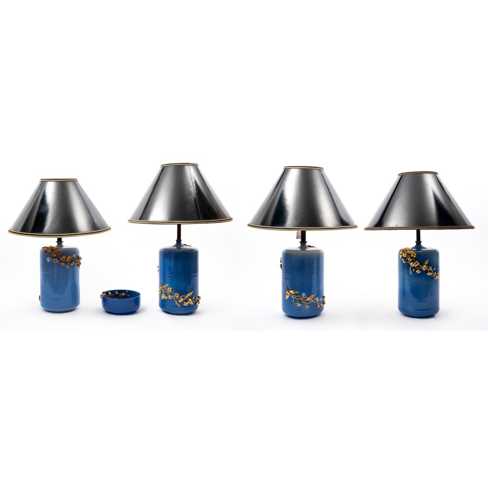 QUATTRO LUMI in ceramica smaltata nei toni del celeste, decori a motivo floreale dorati con paralumi e ciotola in ceramica smaltata nei toni del celeste.