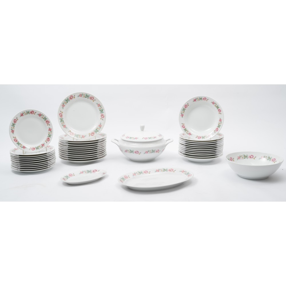 Servizio di piatti in porcellana bianca con bordo decorato a motivo floreale e fogliaceo composto da: 12 piatti piani, 12 piatti fondi, 11 piatti frutta, zuppiera, insalatiera, piatto da portata ovale e raviera (piccole sbeccature e filè).