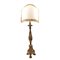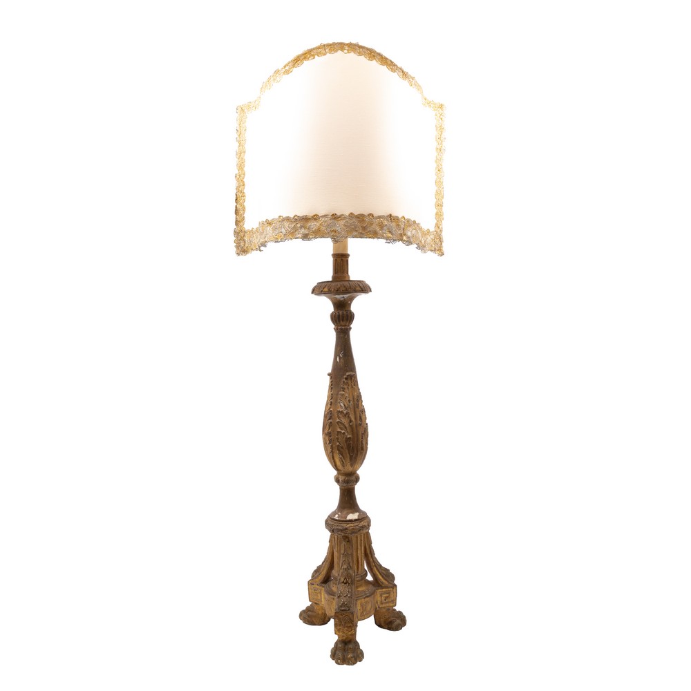 Torciere in legno dorato ad argento a mecca con piedi a zampa leonina, paralume in tessuto trasformato a luce (usure).