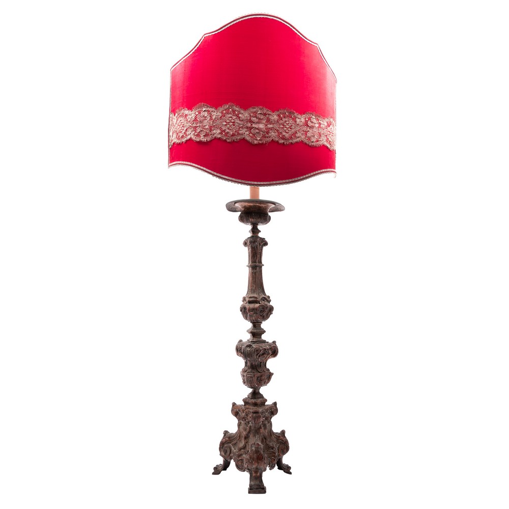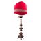 Candeliere rivestito in rame argentato con paralume in tessuto rosso (usure).