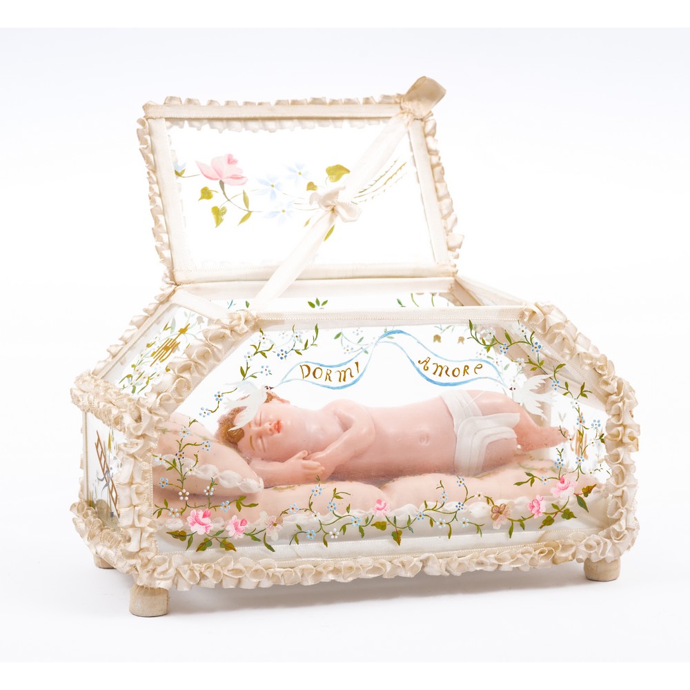 Scultura in ceroplastica raffigurante "Bambinello" entro teca.