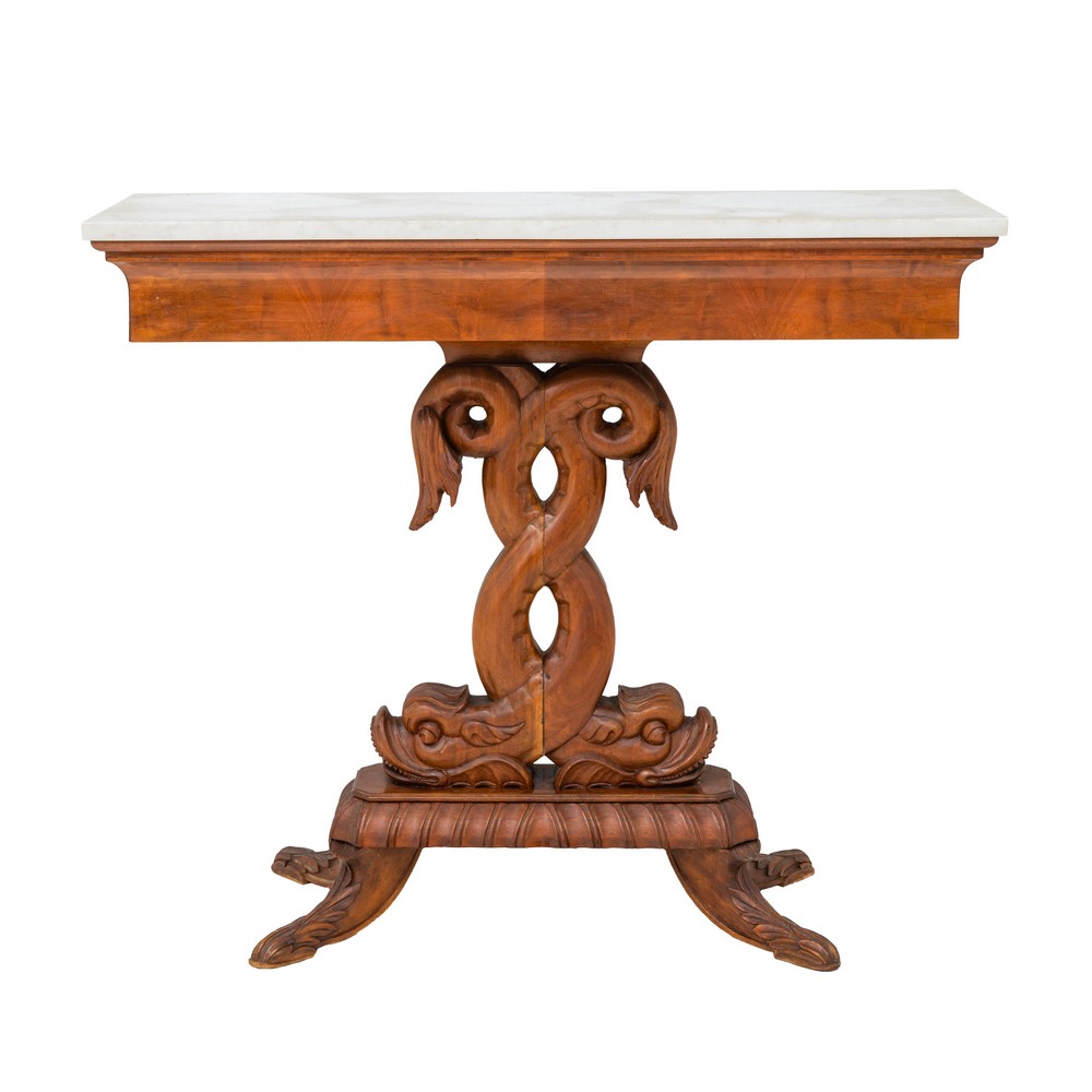 Consolle con cassetto stile Impero in legno di mogano sorretta da delfini, piano in marmo bianco.