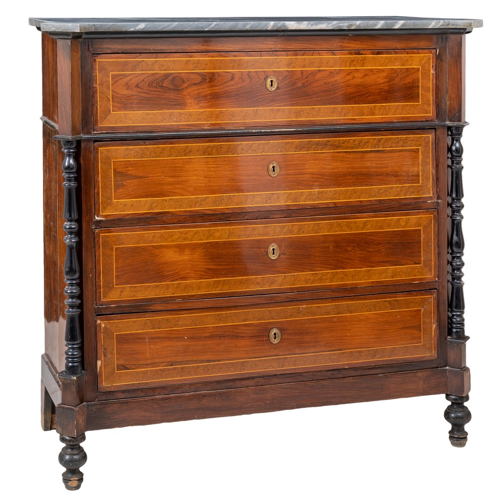 Cassettone a quattro cassetti in legno di palissandro con perfili in bosso, piano in marmo grigio venato.