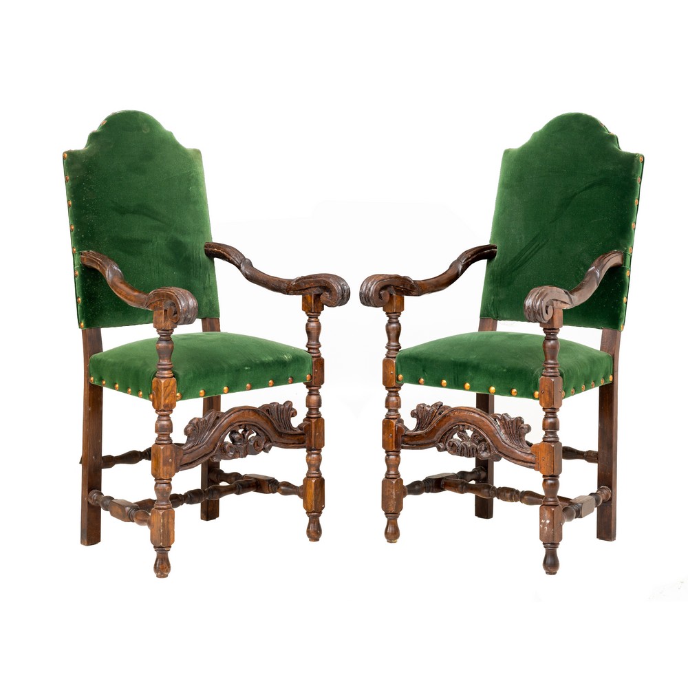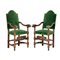 Coppia poltrone a rocchetto in legno di noce con spalliera e seduta tappezzato in velluto verde.