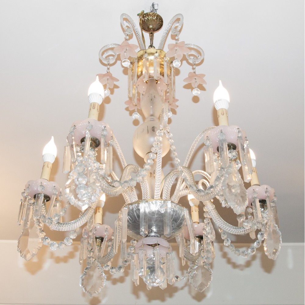 Lampadario in vetro nei toni del biano e del rosa a dodici luci.