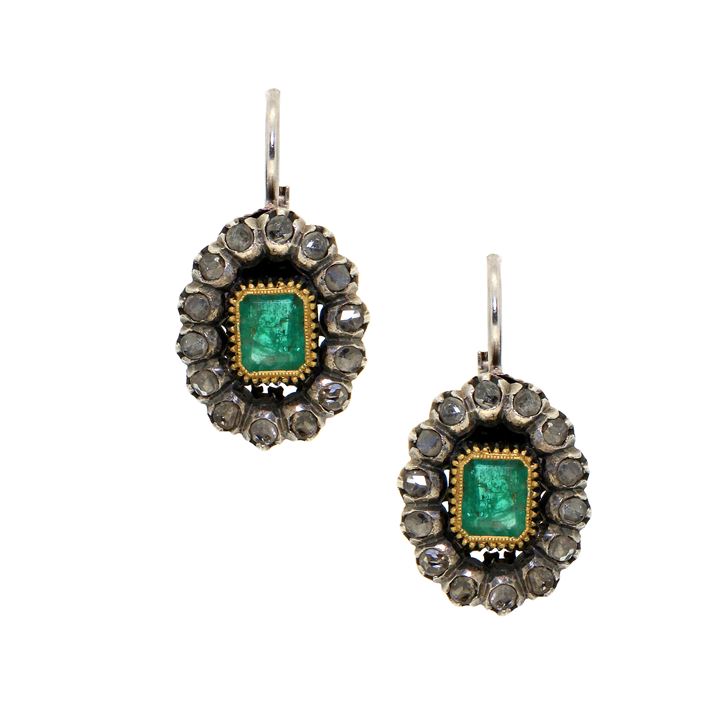 Vecchia coppia di orecchini in oro giallo ed argento, a monachella, con due smeraldi taglio rettangolare e contorno di rosette