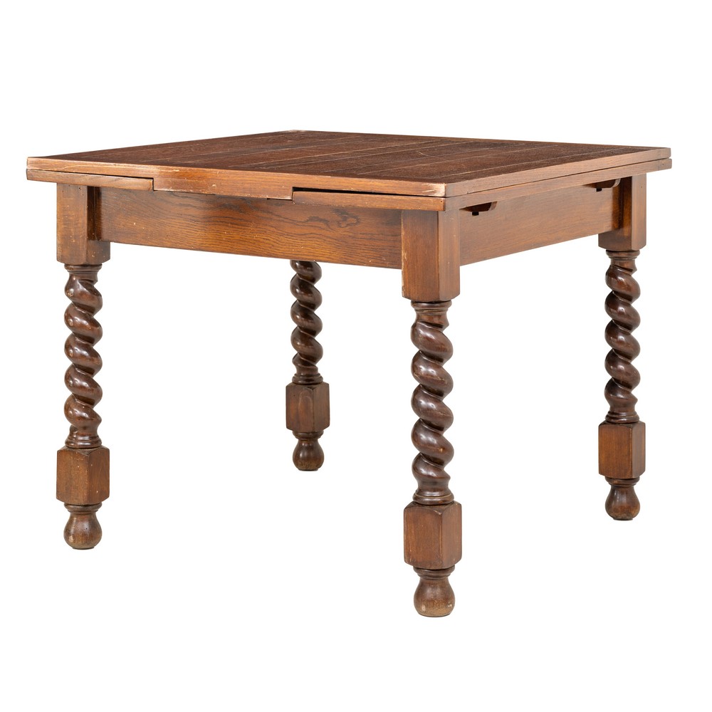Tavolo in legno di rovere allungabile con quattro piedi a torciglioni.