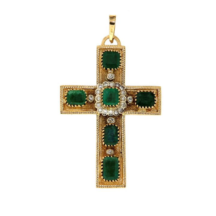 Ciondolo in oro giallo a forma di croce con sei smeraldi taglio smeraldo e piccoli diamanti taglio brillante e 8/8