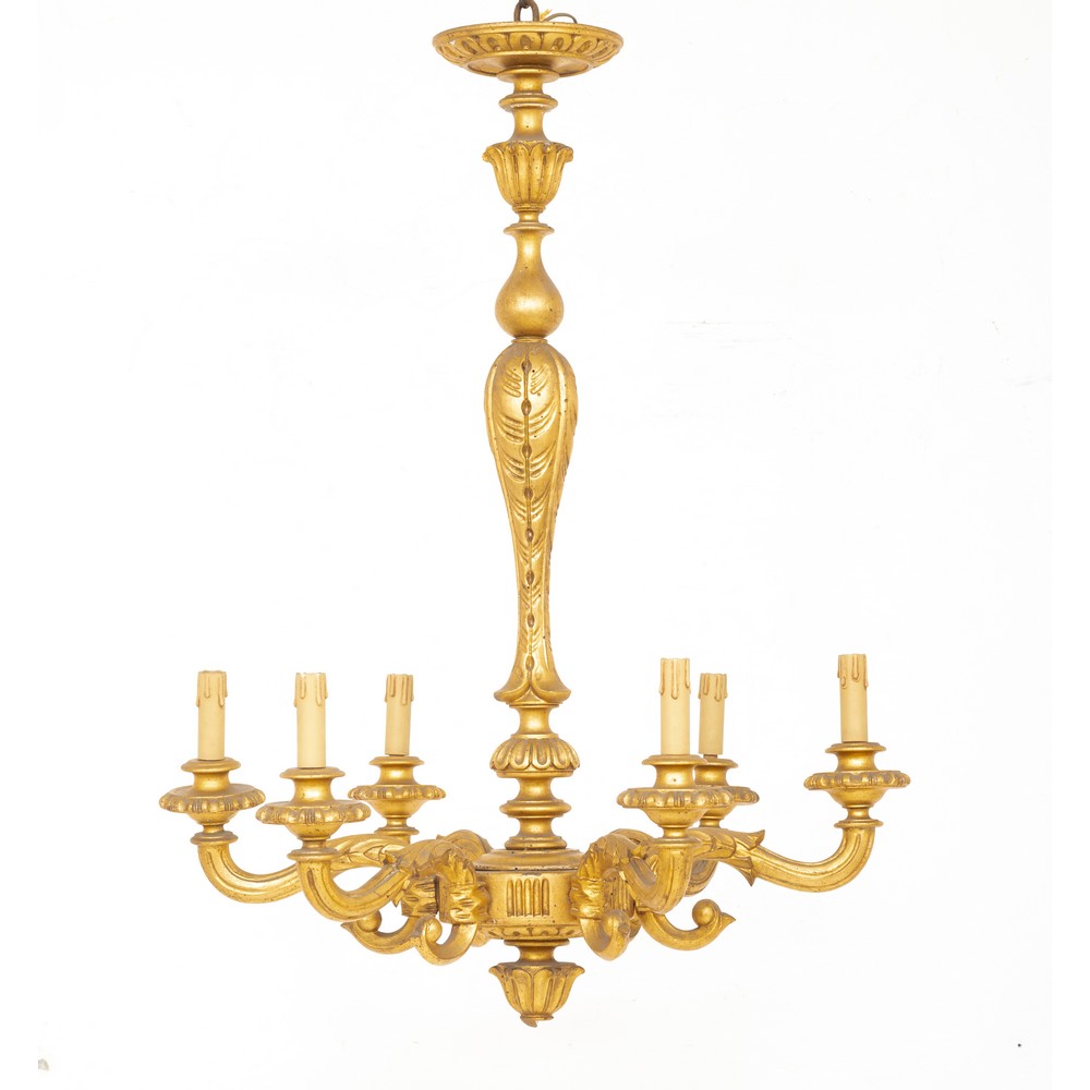 Lampadario di gusto Barocco in legno dorato a sei luci.