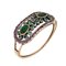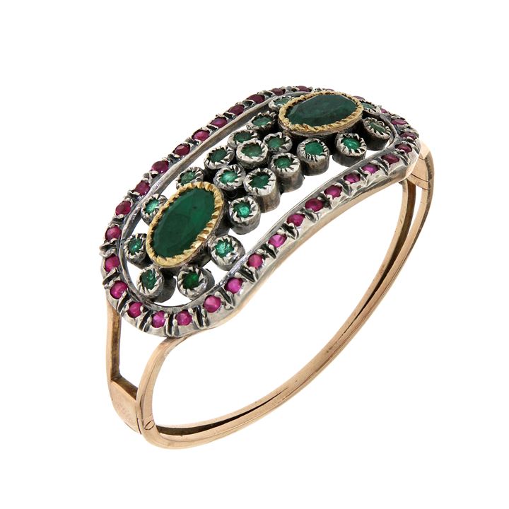 Bracciale rigido in oro giallo, sommità di forma ovale con due smeraldi taglio ovale al centro; a contorno piccoli smeraldi e rubini