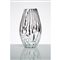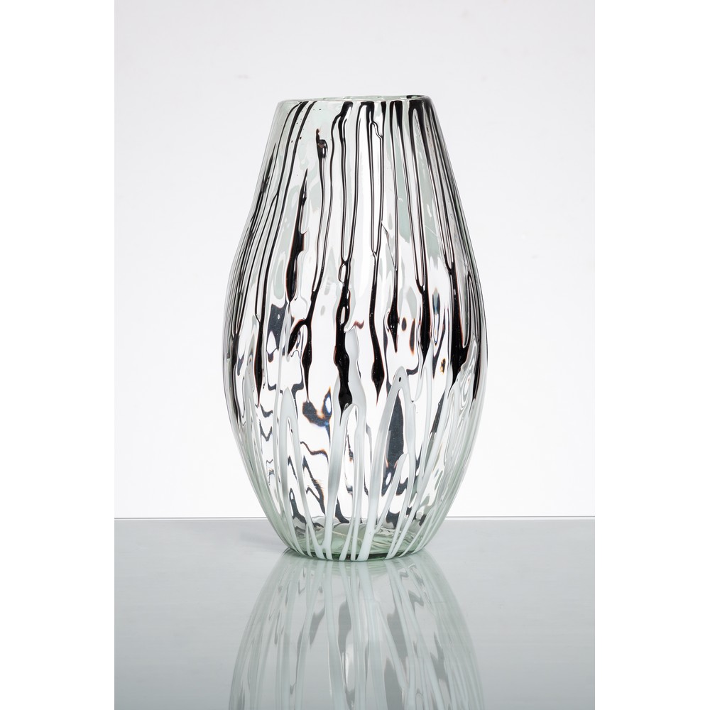 Vaso in vetro trasparente e decorato con colature verticali bianche e nere, corpo ovalizzato con bocca piana circolare.