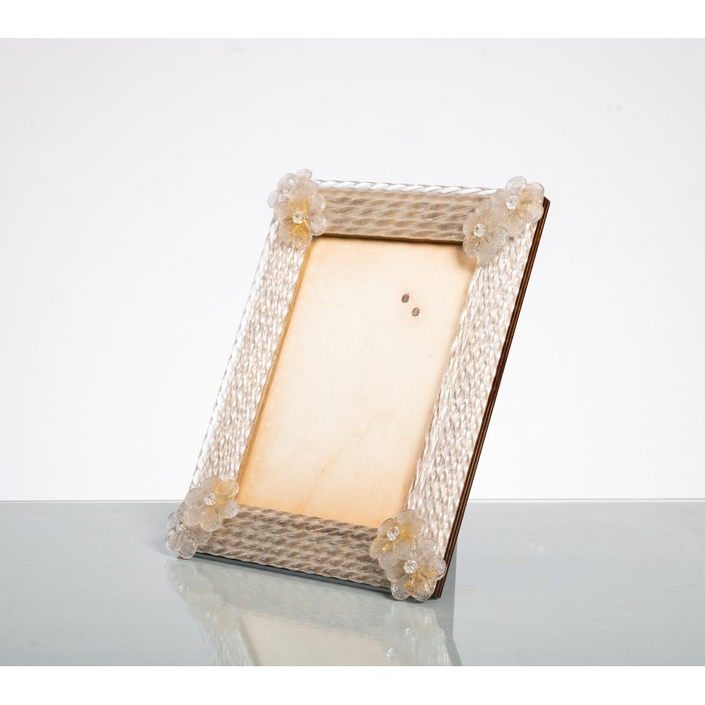 Cornice portaritratti rettangolare decorata sul fronte da cannucce tortili di vetro incolore e oro, decori floreali in vetro oro agli angoli, struttura in legno.