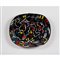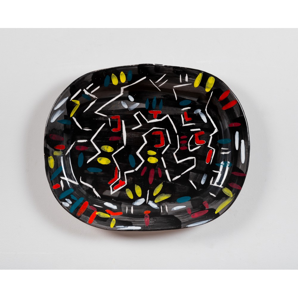 Piatto ovale in ceramica smaltata nera e decorata con motivi astratti policromi. Firma retrostante.