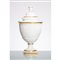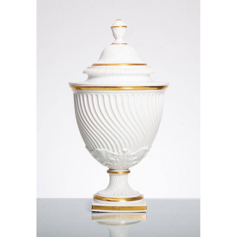 Potiche in porcellana bianca e oro, corpo a coppa con decoro a foglie di acanto e rigature sagomate, coperchio con modanature e pignetta sovrastante. Marchio di produzione.