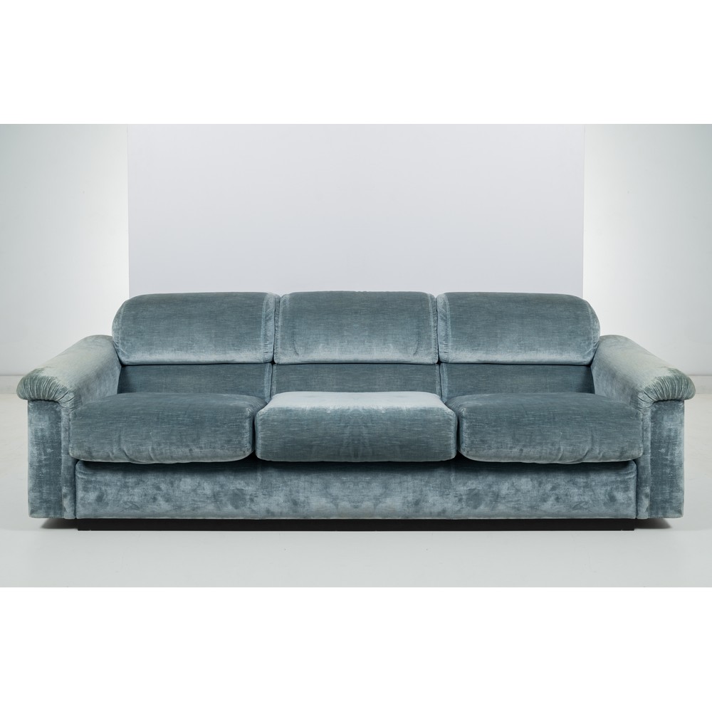 Divano a tre posti modello “ Blasonado”, scocca in materiale plastico con imbottitura e rivestimento in velluto nei toni carta da zucchero.