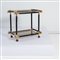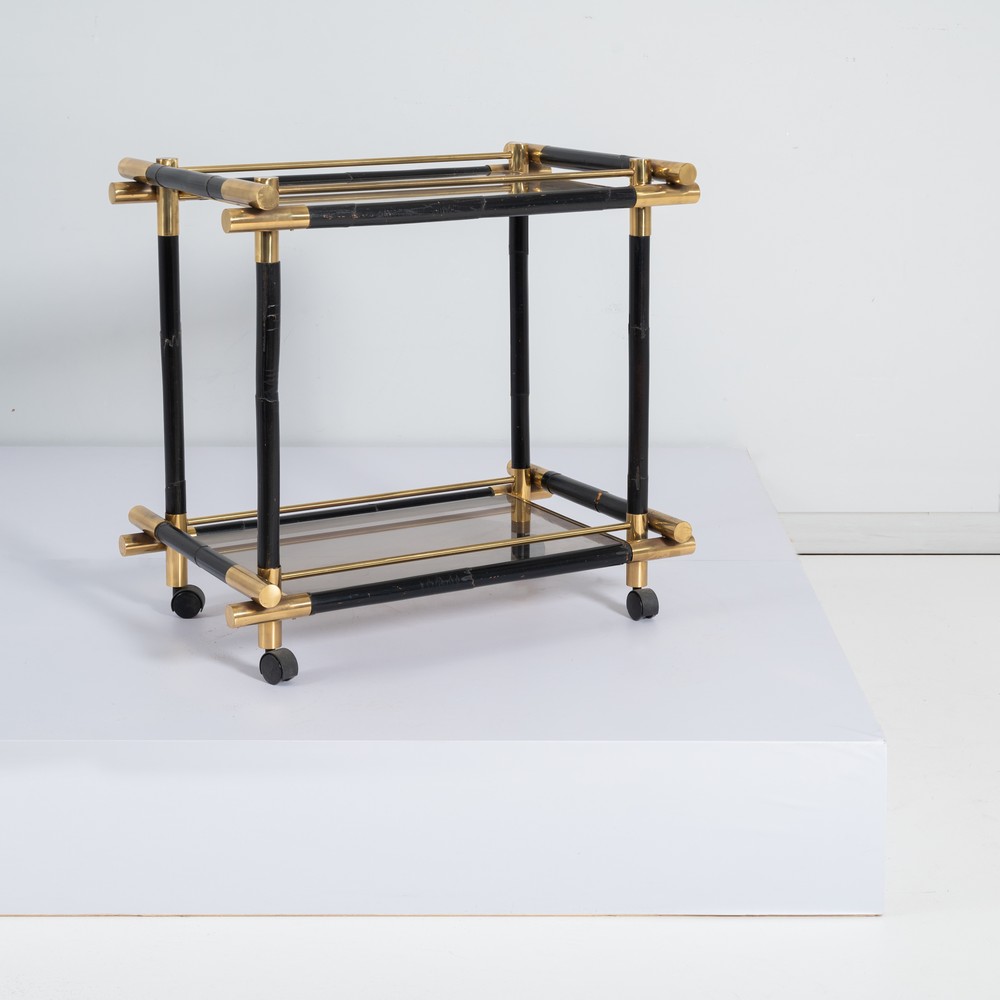 Carrello con struttura in canna di bamboo ebanizzata, giunti in ottone, due ripiani in vetro, ruote nere. Lievi graffi.