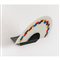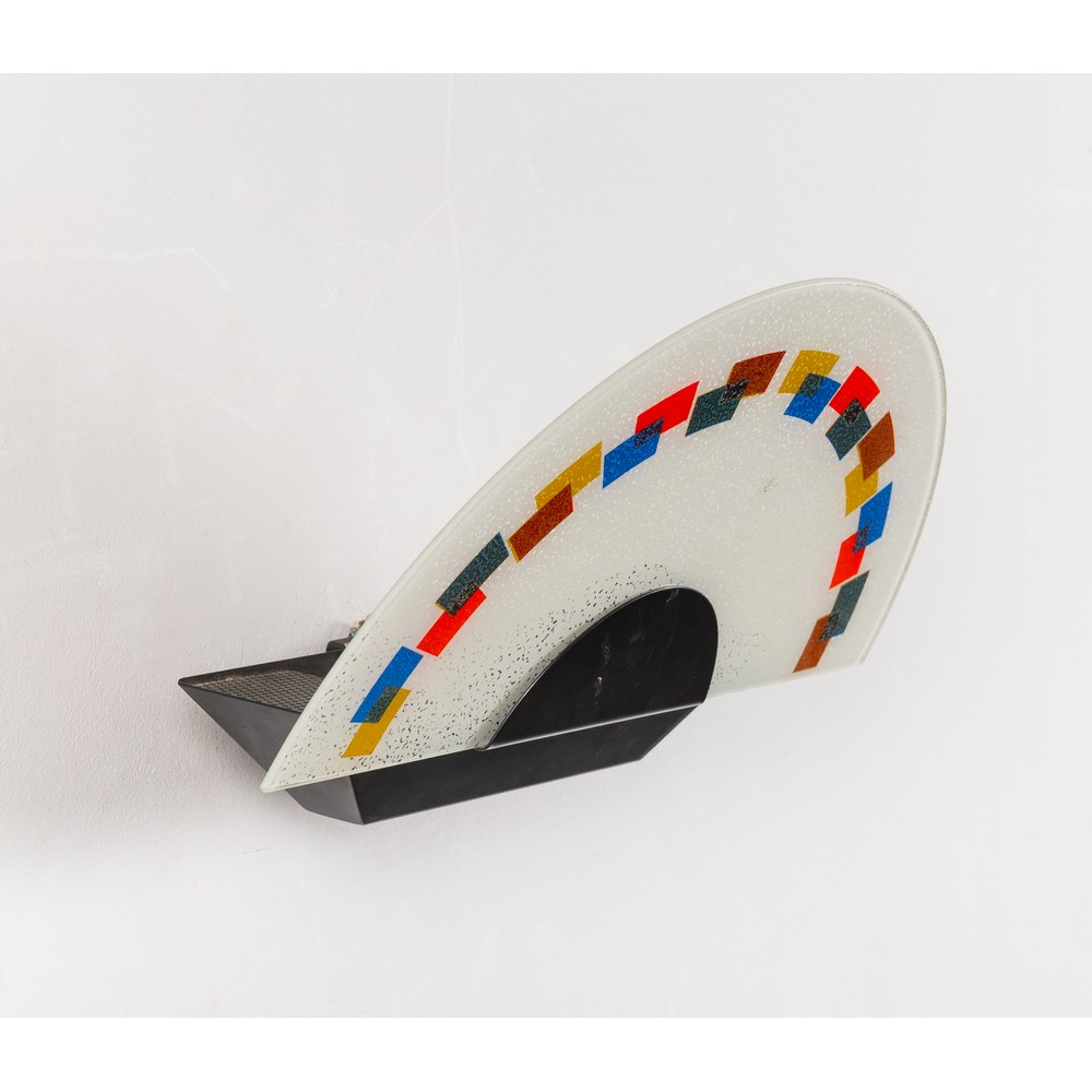 Una lampada a sospensione ad una luce con diffusore a disco circolare in vetro satinato e decorato con motivi geometrici colorati, metallo verniciato. Una lampada da parete ad una luce con diffusore a disco semicircolare in vetro satinato e decorato con motivi geometrici colorati, metallo verniciato.