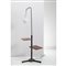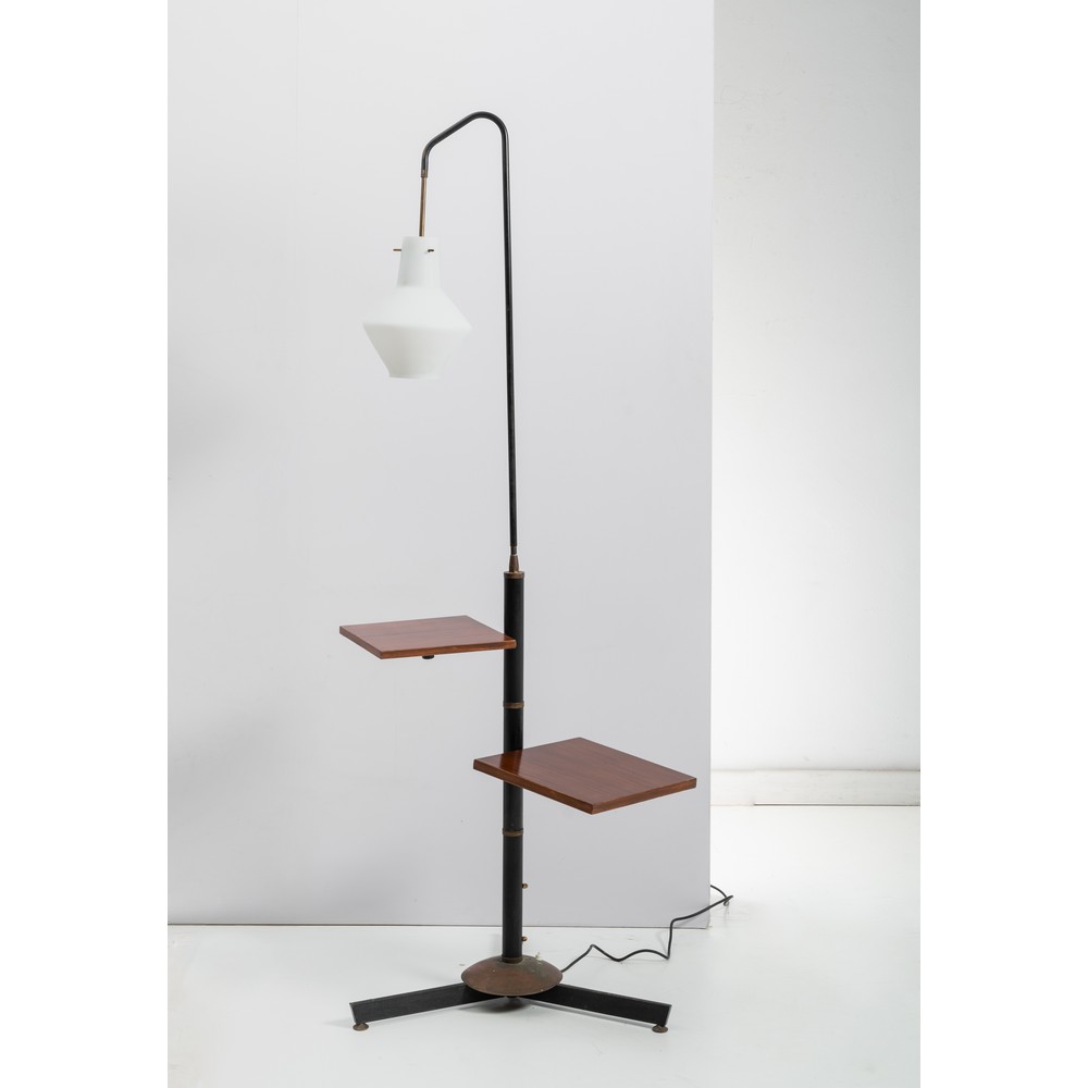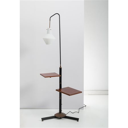 Lampada da terra ad una luce, struttura in metallo verniciato nero, ottone, diffusore in vetro opalino satinato, due ripiani in legno portariviste, piede tripode in metallo verniciato nero.