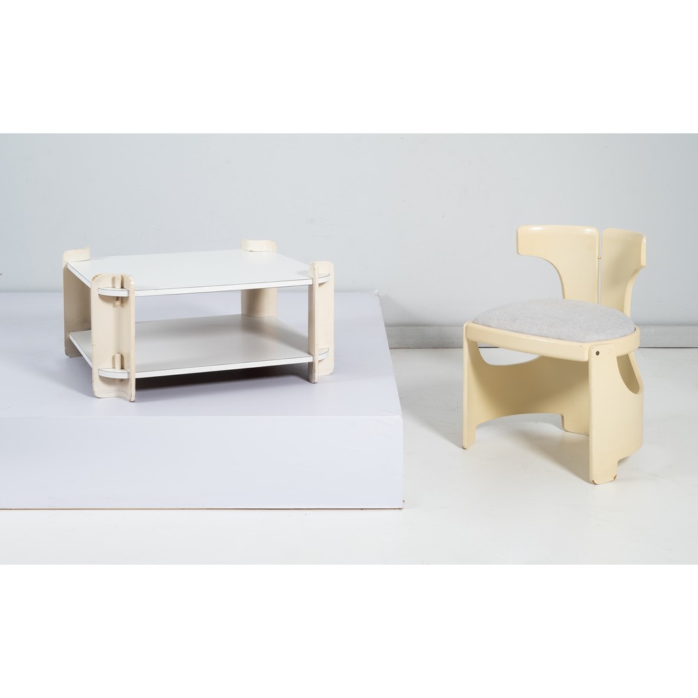 Un tavolo basso in legno laccato bianco, corpo quadrato, due ripiani con angoli arrotondati. Una sedia in legno laccato avorio, schienale sagomato, seduta imbottita e rivestita con tessuto grigio. Segni di usura e un piano in vetro mancante.