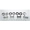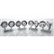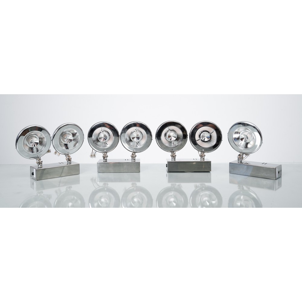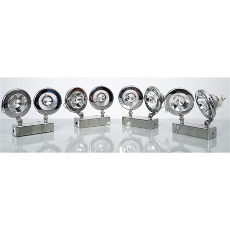 Otto lampade da soffitto-parete, sette a due luci orientabili ed una ad una luce orientabile, struttura e diffusori in metallo cromato.