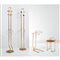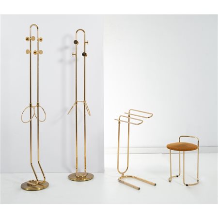 Quattro accessori da bagno in tubolare di ottone lucido così suddivisi: due colonne appendiabiti con anelli porta asciugamani, una colonna bassa porta asciugamani, uno sgabello con seduta circolare imbottita e rivestita con tessuto nei toni del marrone.