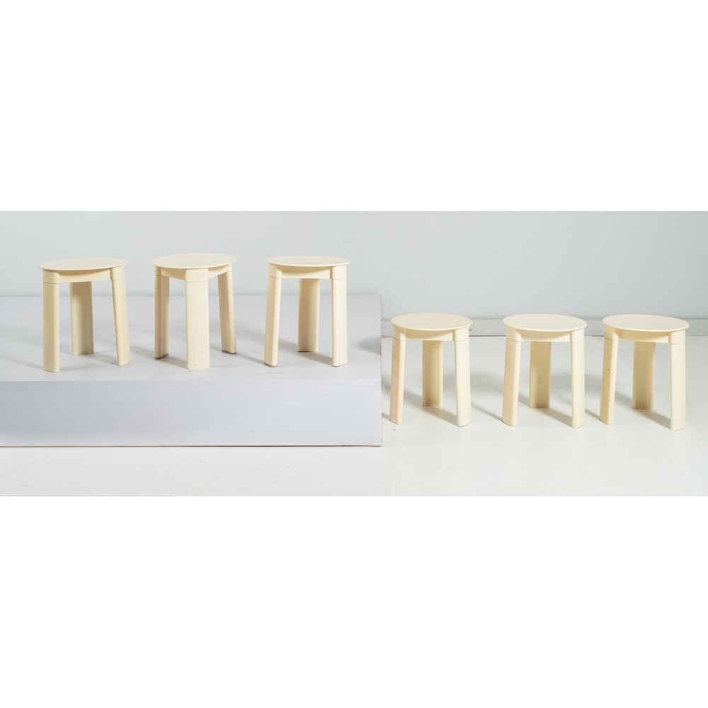 Sei sgabelli-tavoli in materiale plastico bianco, piano circolare su tre piedi.