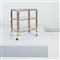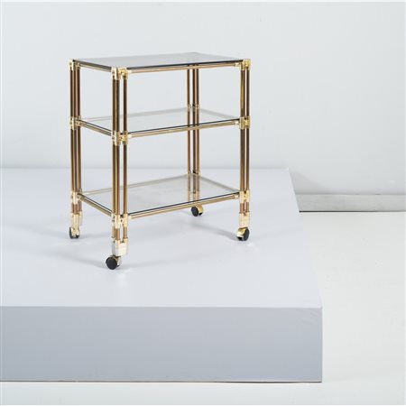 Carrello con struttura e giunti in tubolare di metallo dorato, tre piani rettangolari in vetro trasparente, ruote in metallo e materiale plastico. Segni d’uso.