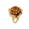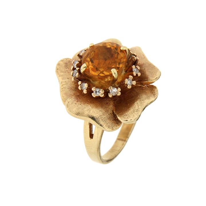 Anello in oro giallo satinato, sommità a forma di fiore, con al centro quarzo citrino taglio rotondo e contorno di diamanti taglio 8/8 per complessivi ct 0,12 ca