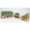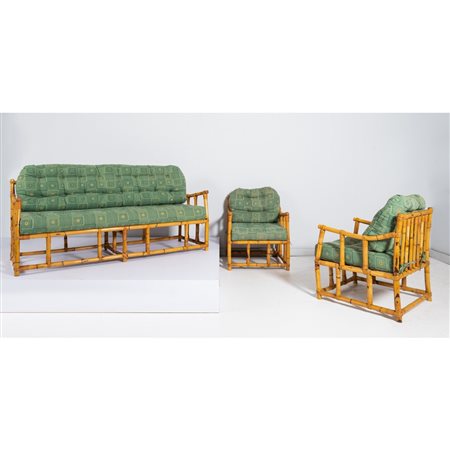 Salotto composto da divano e due poltrone in canna di bamboo e rattan, cuscini con imbottitura e rivestiti in tessuto verde.