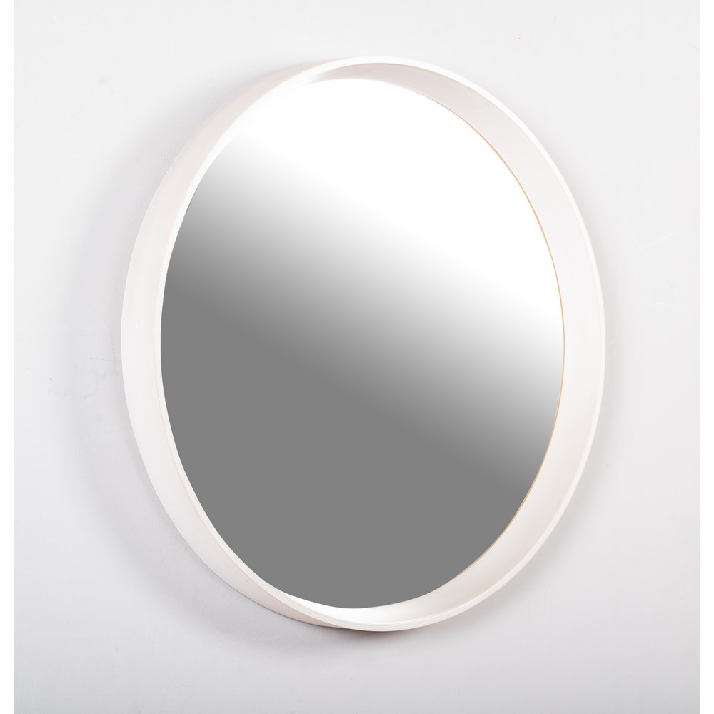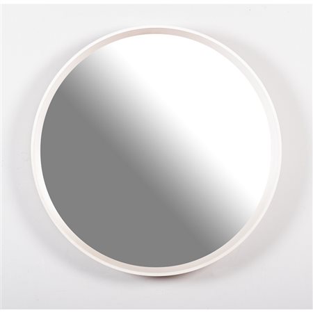 Specchio da parete di forma circolare, cornice in legno laccato bianco, cristallo specchiato centrale.
