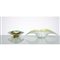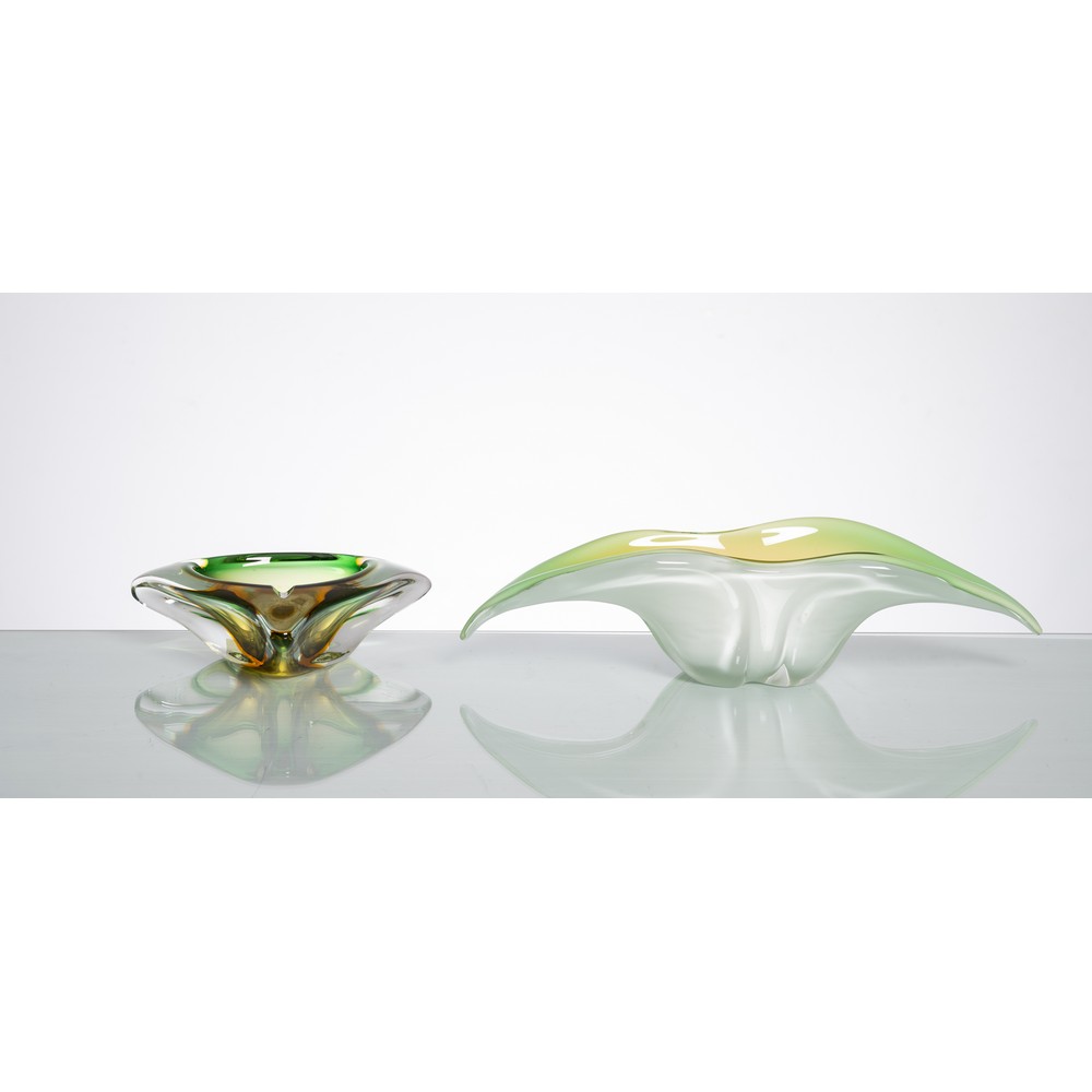 Un posacenere in vetro sommerso trasparente, ambra e verde, corpo quadrangolare. Un centrotavola in vetro incamiciato lattimo, verde e pagliesco, corpo a coda di pesce.
