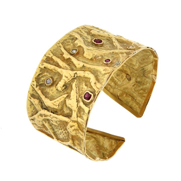 Bracciale rigido in oro giallo, interamente lavorato a motivi astratti, piccoli diamanti taglio brillante per complessivi ct 0,15 ca e rubini taglio rotondo