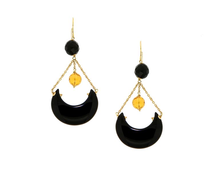 Coppia di orecchini pendenti, in oro giallo, con mezze lune e sfere sfaccettate in onice, intervallate da due sfere in quarzo citrino sfaccettato