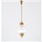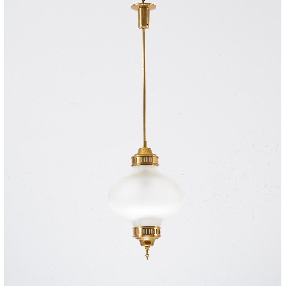 Lampada a sospensione ad una luce, struttura in ottone lucido, diffusore cilindrico in vetro satinato con decoro a righe trasparenti.
