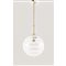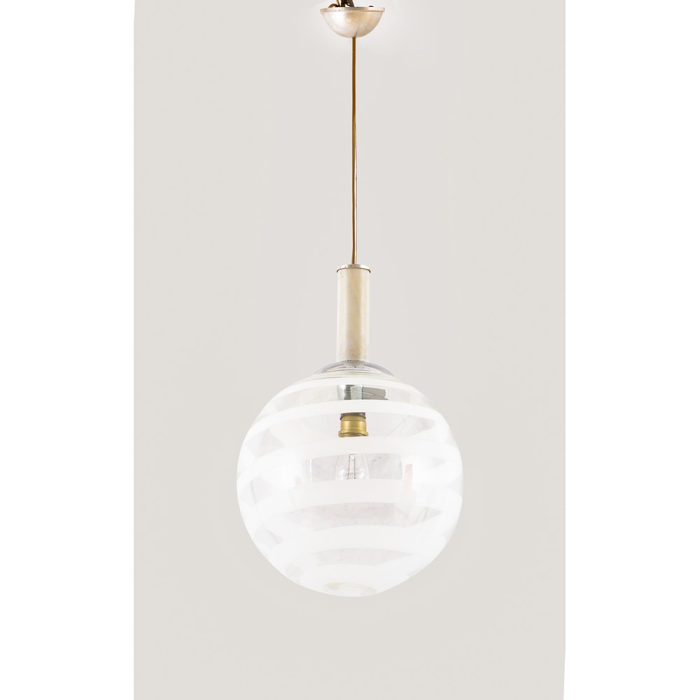 Lampada a sospensione ad una luce, struttura in metallo cromato, diffusore sferico in vetro trasparente con decori a spirale in vetro lattimo.