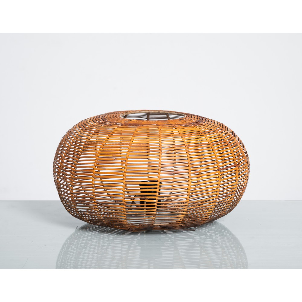 Lampada da tavolo ad una luce, struttura in metallo con diffusore sferico in rattan intrecciato.