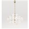 Lampada a sospensione a cinque luci, struttura in metallo cromato, diffusore a cinque piani composto da dischi circolari in vetro lattimo con bordo trasparente.