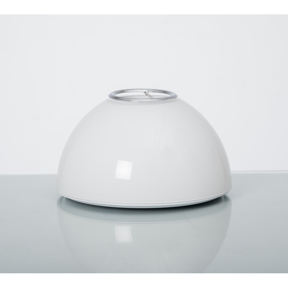 Lampada da soffitto modello “Tilos” ad una luce, struttura in metallo verniciato e cromato, diffusore semisferico in vetro lattimo.