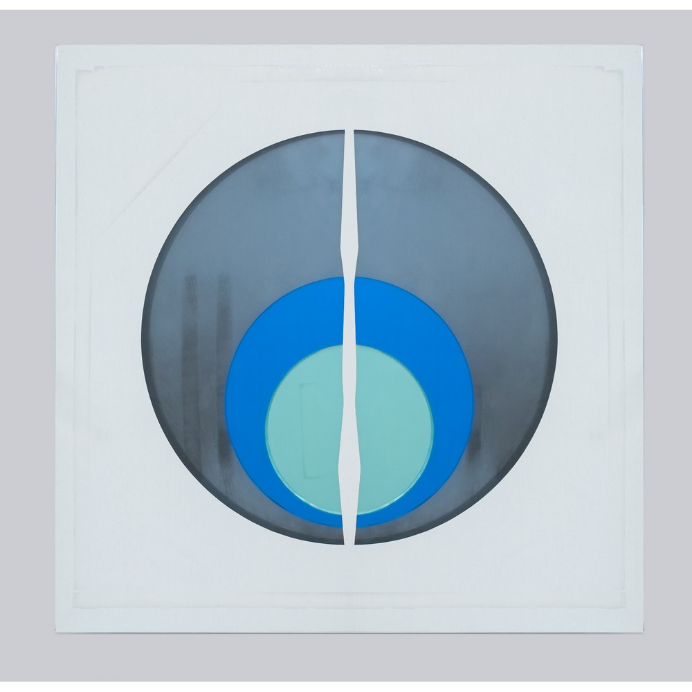 Specchio scultura da parete di forma quadrata, composto da lastre sovrapposte di specchi blu e verdi, cristallo specchiato.