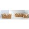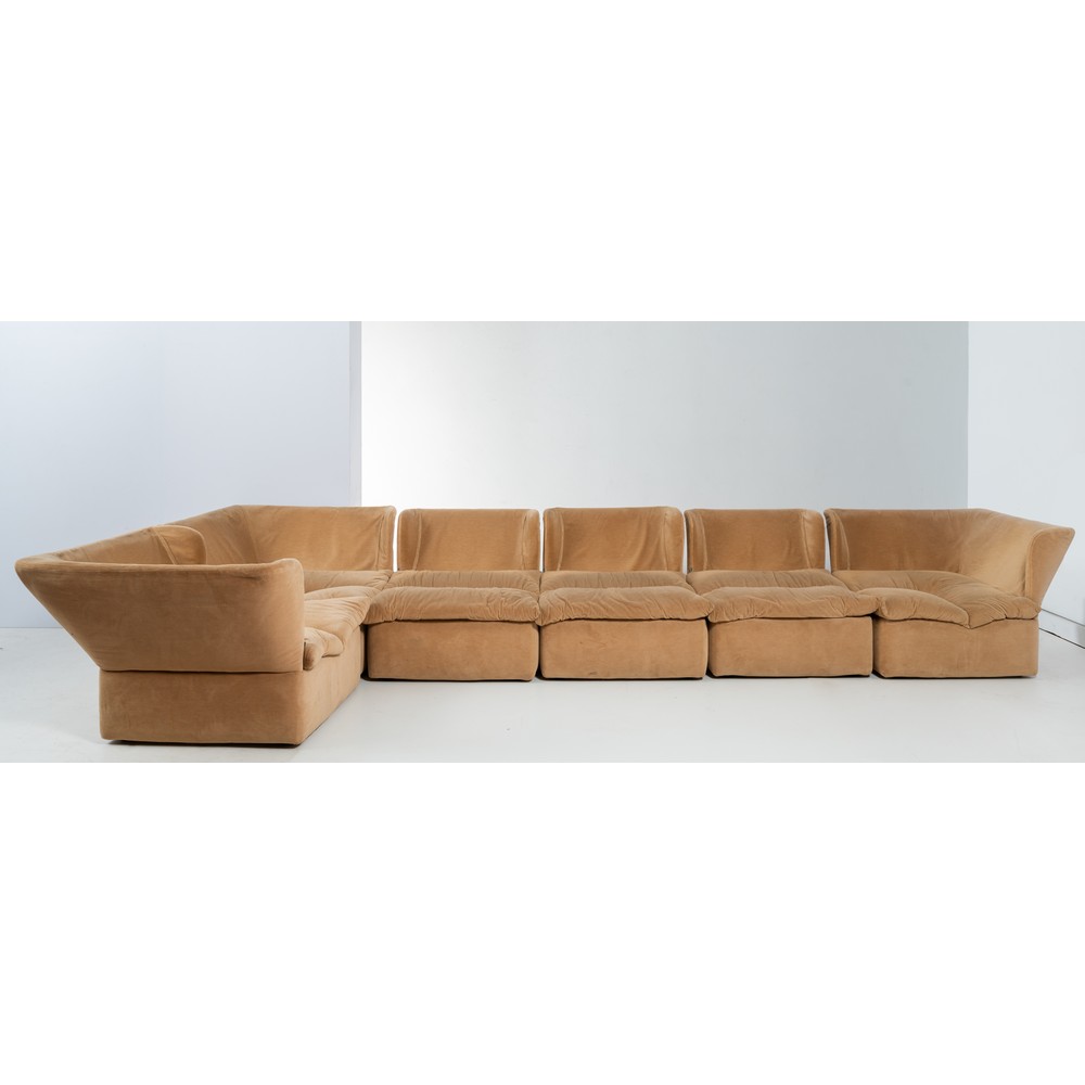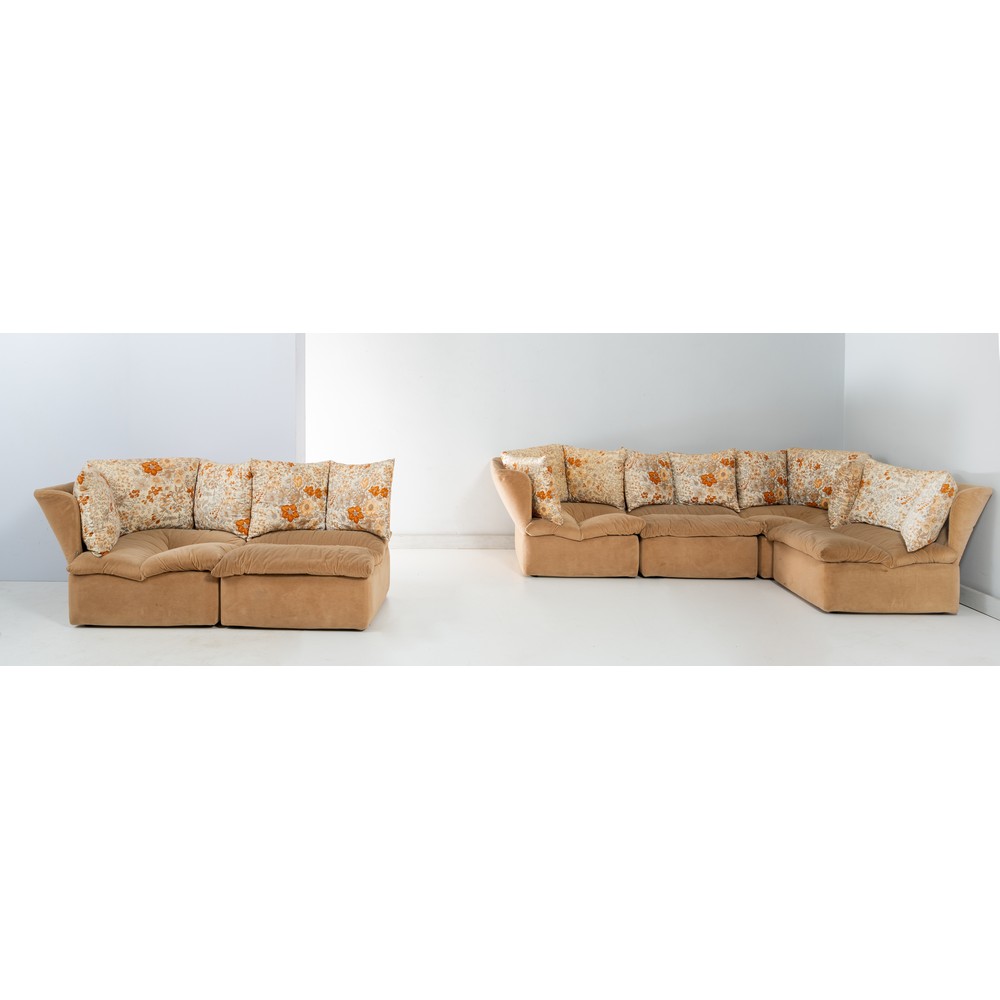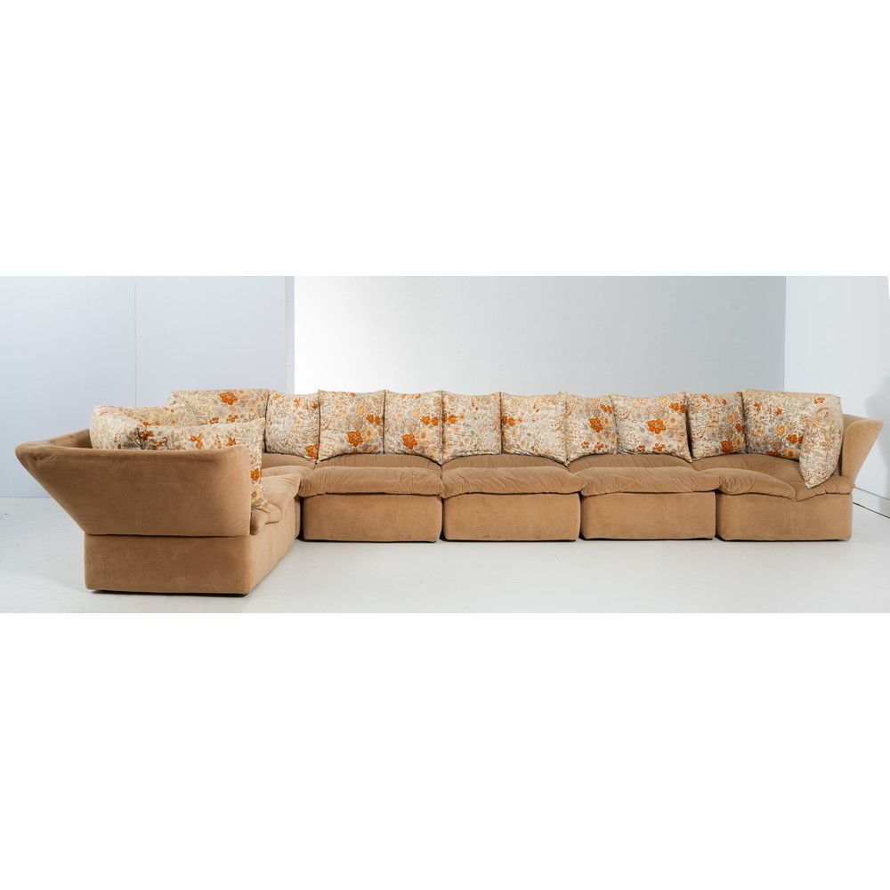 Divano angolare modulare composto da otto elementi, struttura in legno con imbottitura e rivestimento in velluto beige, cuscini in cotone a fantasia floreale nei toni avorio, marrone ed arancione.