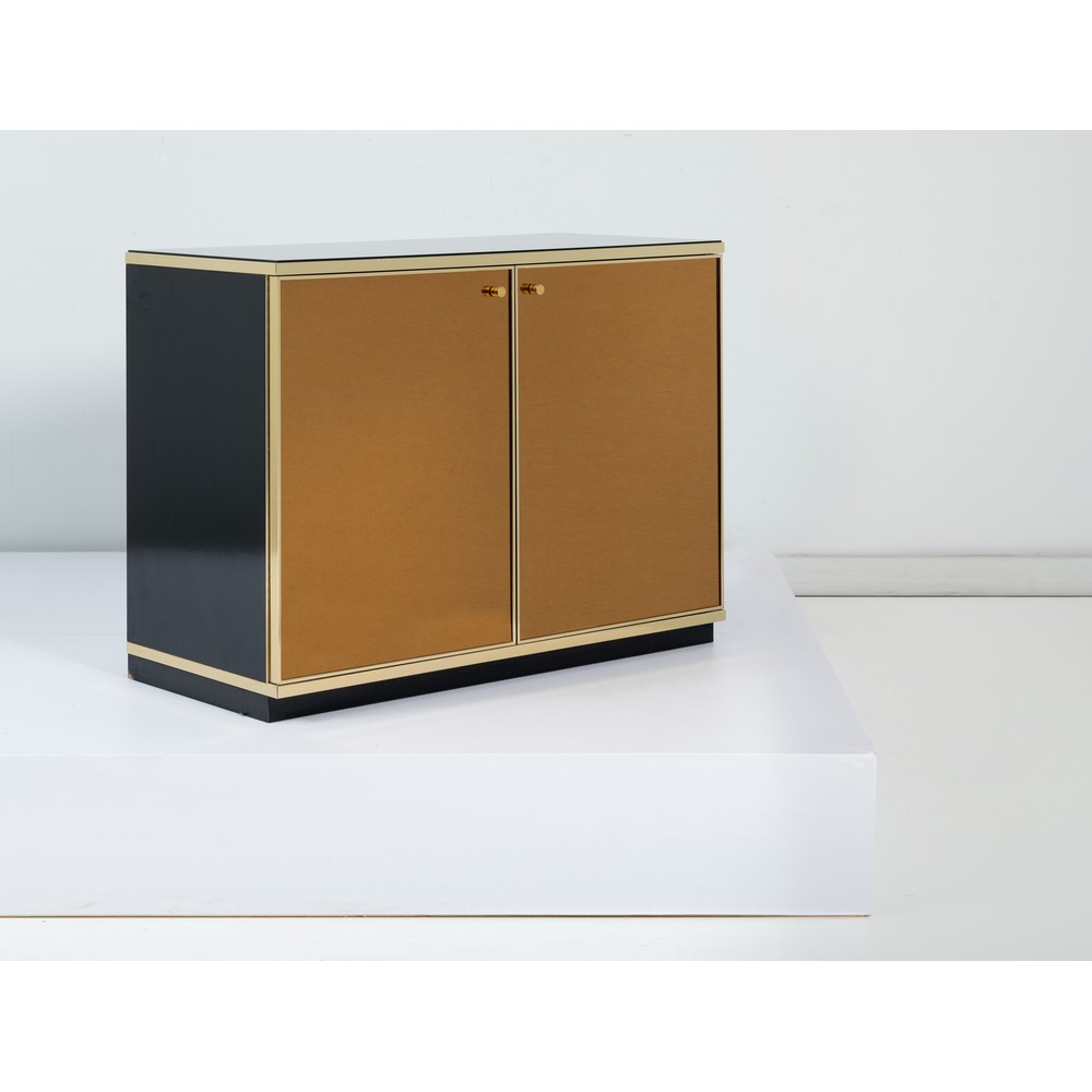 Sideboard in legno laccato nero, fronte con vano chiuso da due ante battenti a specchio fumè e ottone, piano rettangolare in vetro opalino nero.