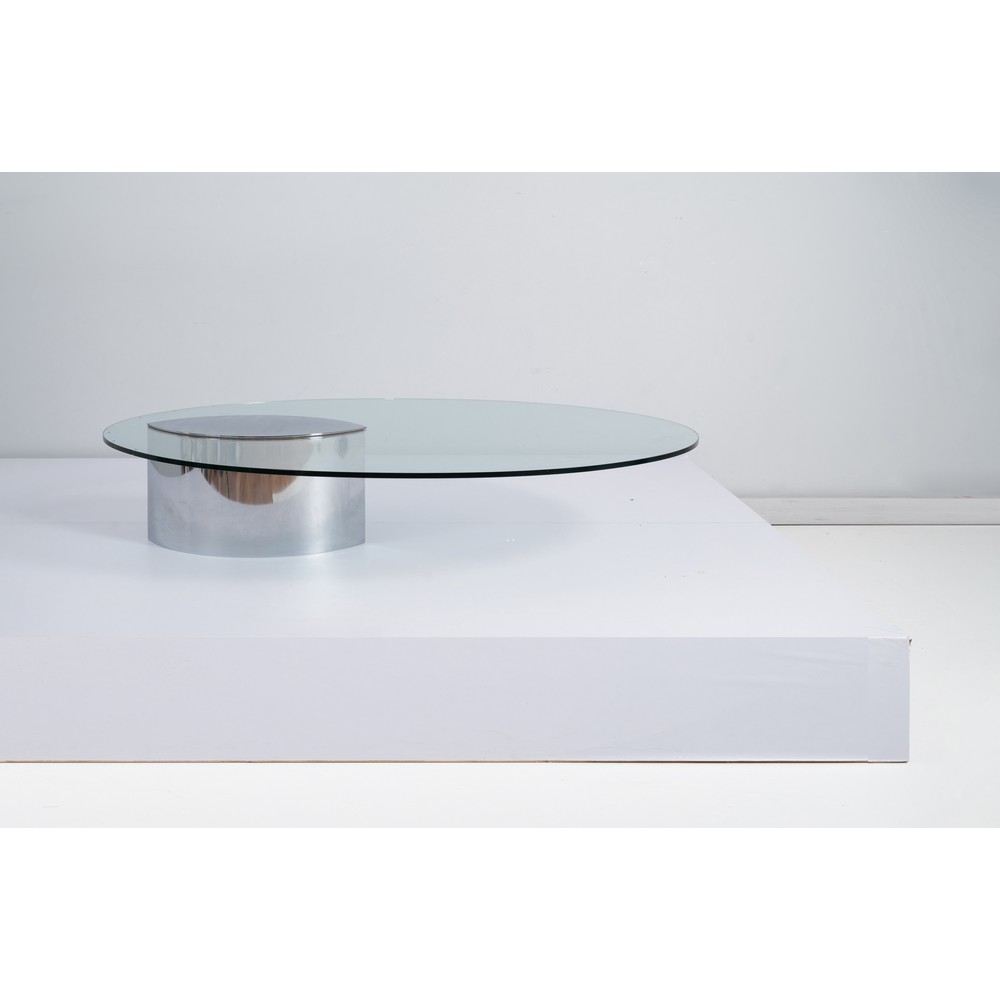 Tavolo da salotto modello “Lunario”, base in acciaio cromato, ghisa, piano ovale in cristallo trasparente temperato.