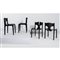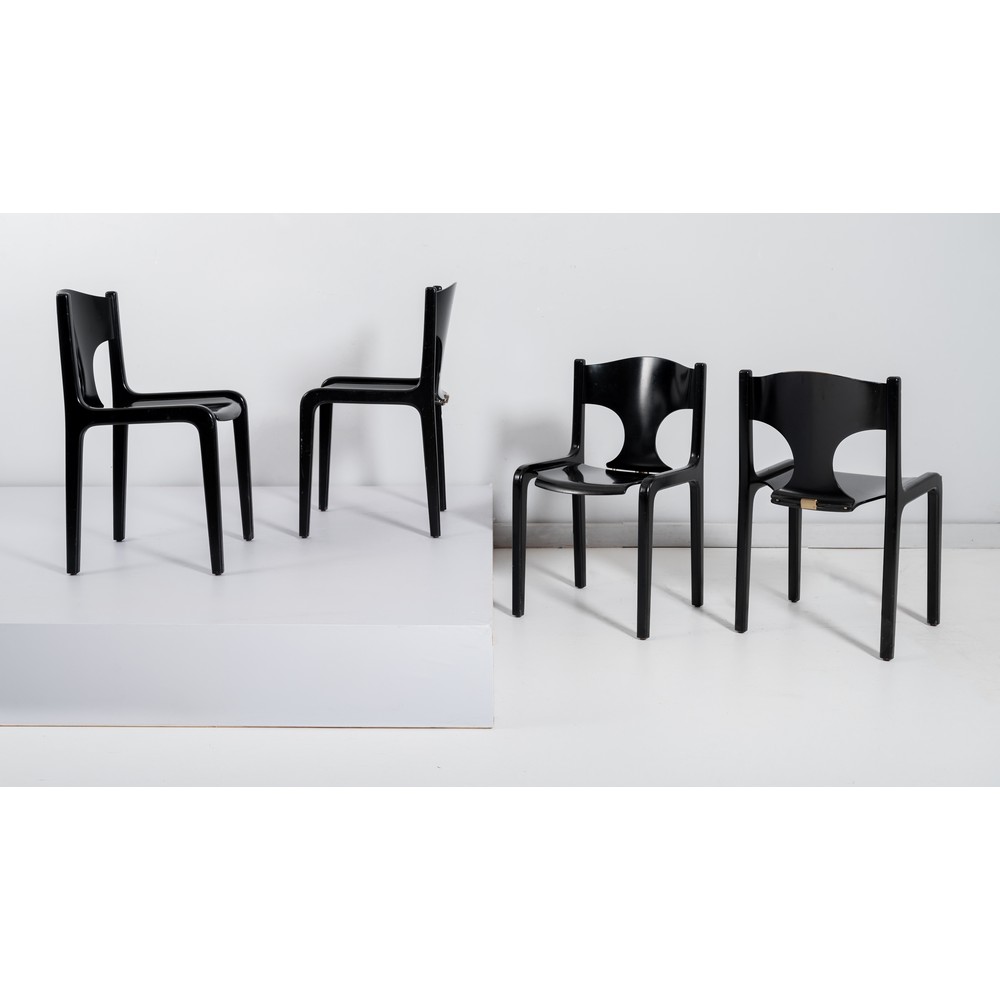 Quattro sedie in legno laccato nero, spalliera sagomata e seduta curvata.