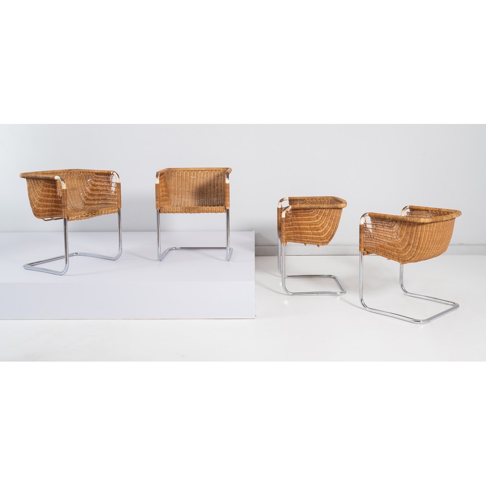 Quattro sedie modello “D43” con struttura in tubolare curvato e cromato, seduta e spalliera in rattan. Difetti al rattan.